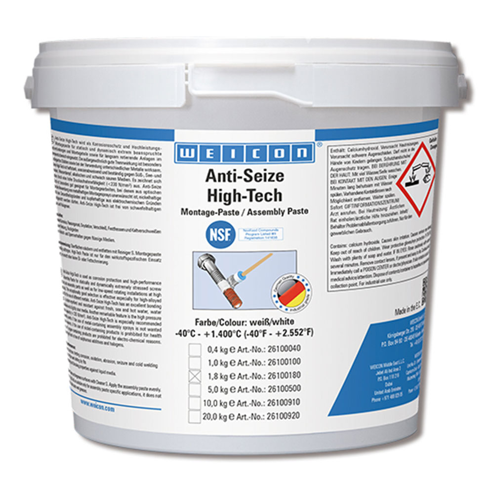 Паста Weicon Anti-Seize High-Tech обладает отличной устойчивостью к высоким температурам, имеет хорошие уплотнительные свойства и непроницаемостью по отношению к жидким средам. Сертифицирован NSF и подходит к применению в пищевой промышленности.