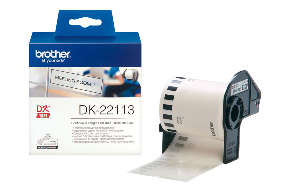 Оригинальная лента Brother DK22113 для печати наклеек. Непрерывная бумажная лента 62 мм х 15.24 м, прозрачная.