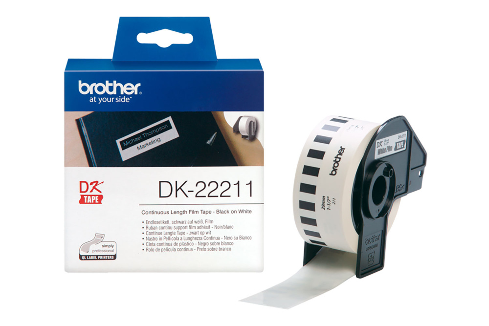 Оригинальная лента Brother DK22211 непрерывная плёночная лента для печати наклеек, 29 мм х 15.24 м, белая.