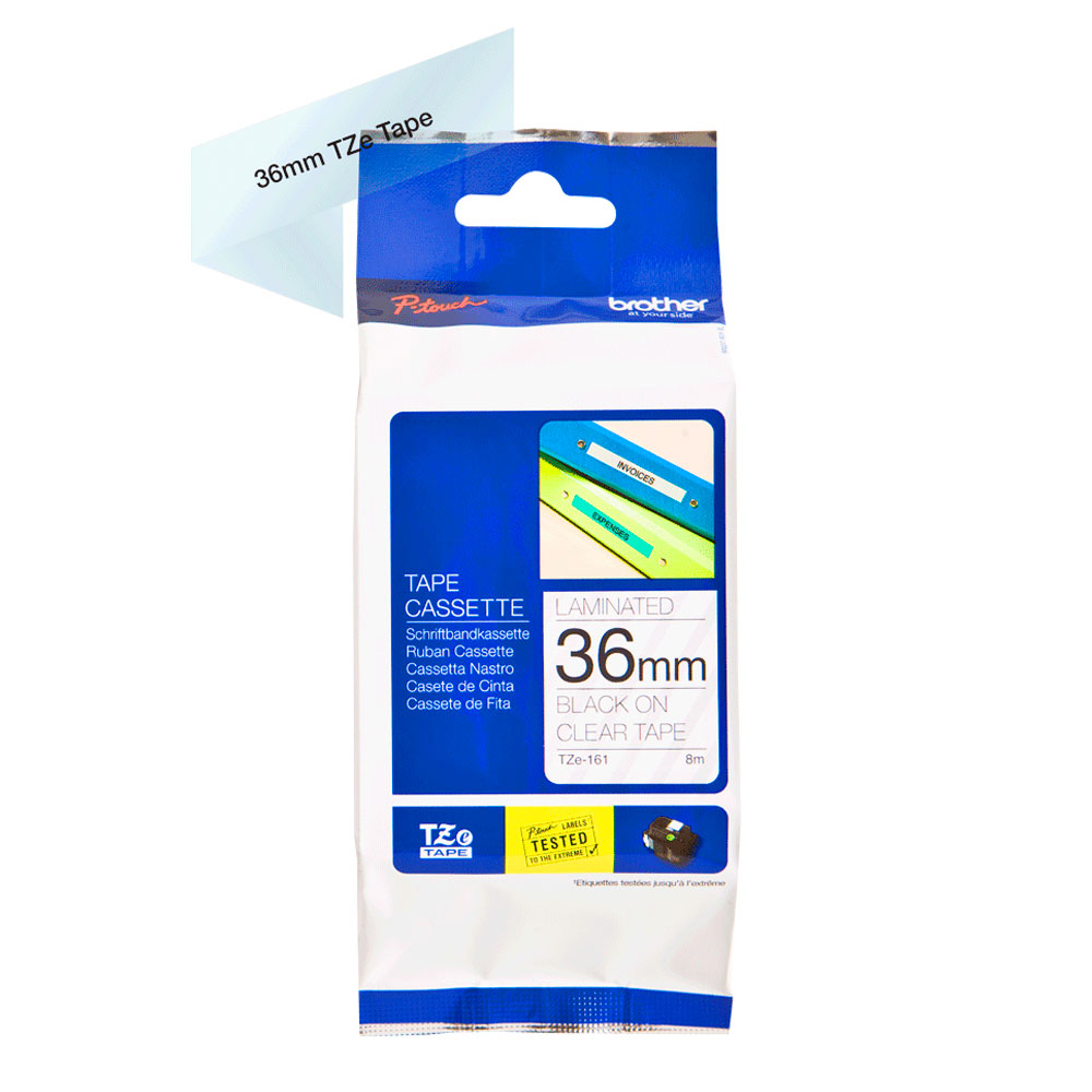 Картридж с лентой Brother TZe-161: черный текст на прозрачном фоне, ширина ленты 36 мм, длина 8 м.