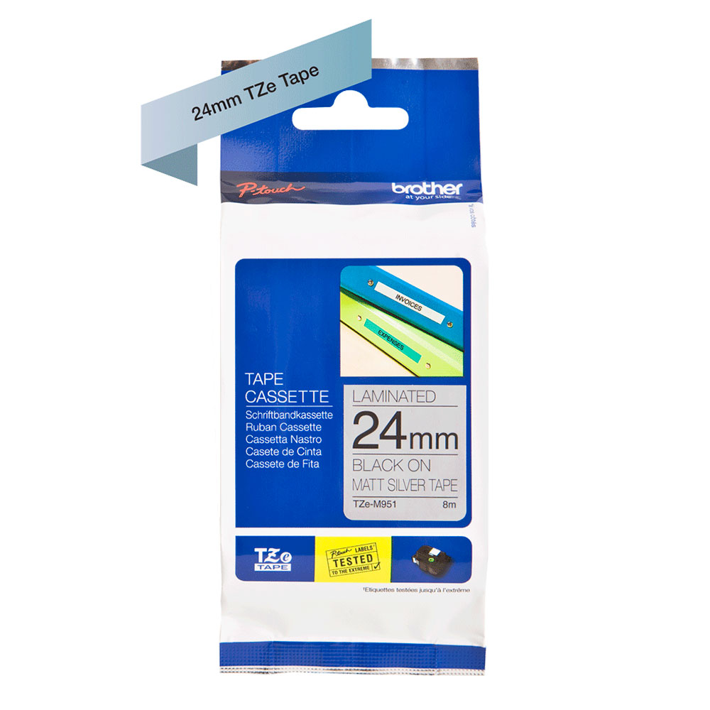 Картридж с лентой Brother TZe-M951: черный текст на матовом серебряном фоне, ширина ленты 24 мм, длина 8 м.