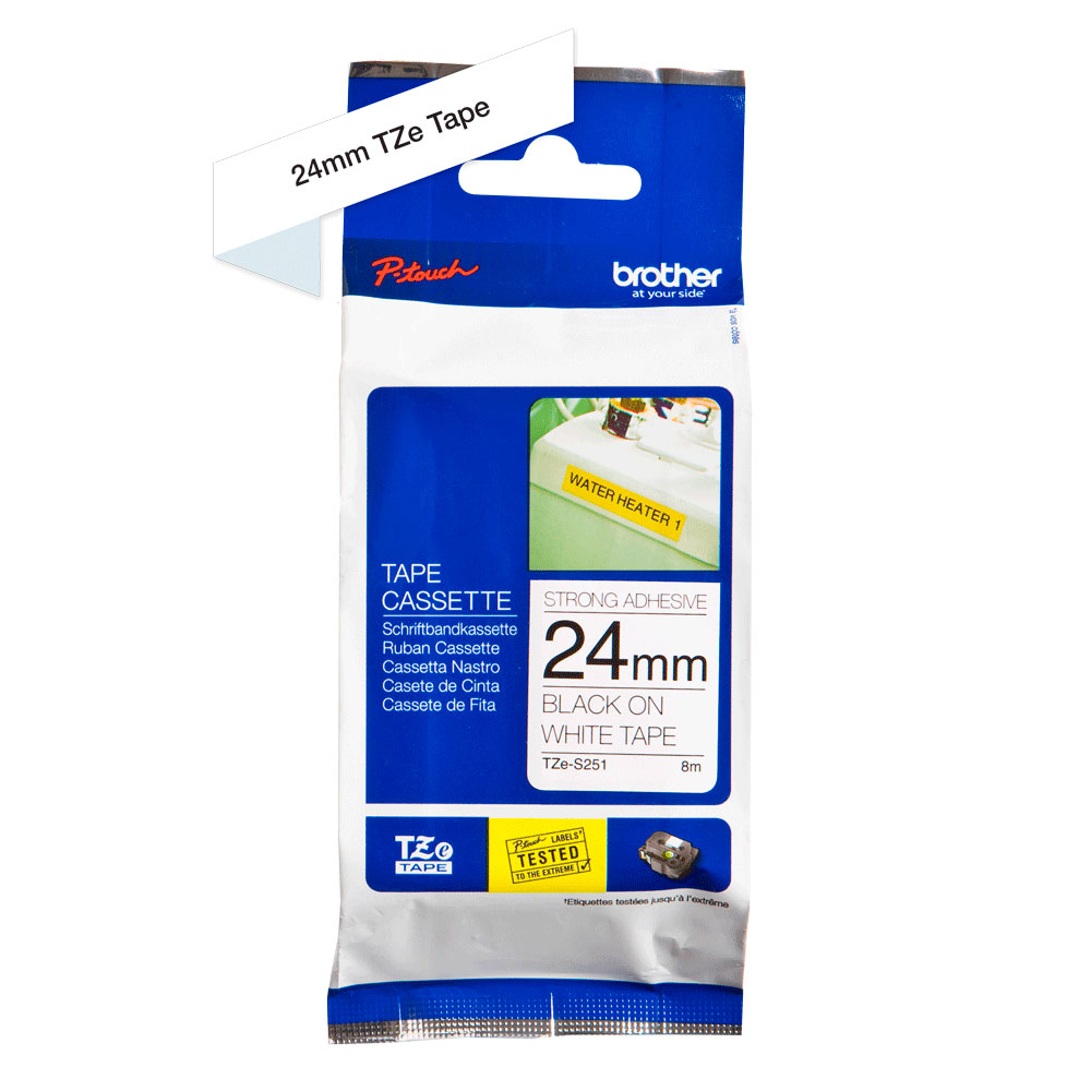 Картридж с сверхклейкой лентой Brother TZe-S251: черный текст на белом фоне, ширина ленты 24 мм, длина 8 м.