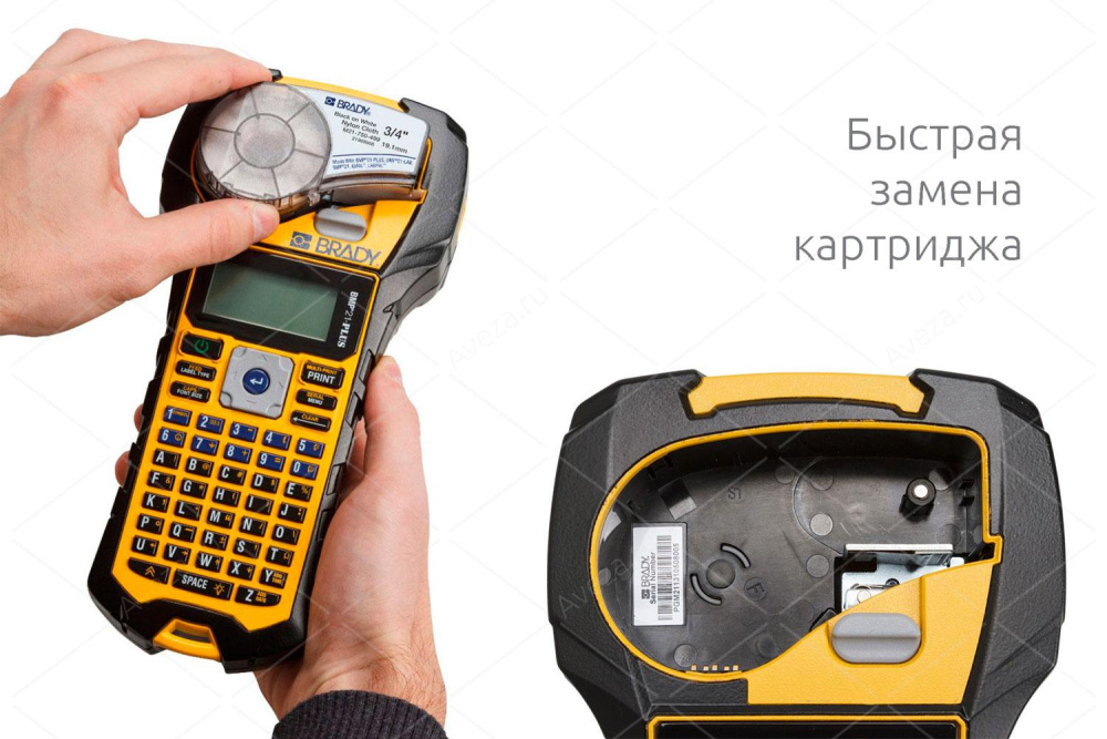 Принтер BMP21 Plus печатает на специальном картридже с лентой шириной от 6 до 19 мм. Пользователям представлен большой выбор материалов в виде самоклеящейся ленты или термоусадочной трубки. Напечатанная информация не смазывается и не стирается от механического воздействия, также наклейки устойчивы к воздействию солнечных лучей и растворителей.