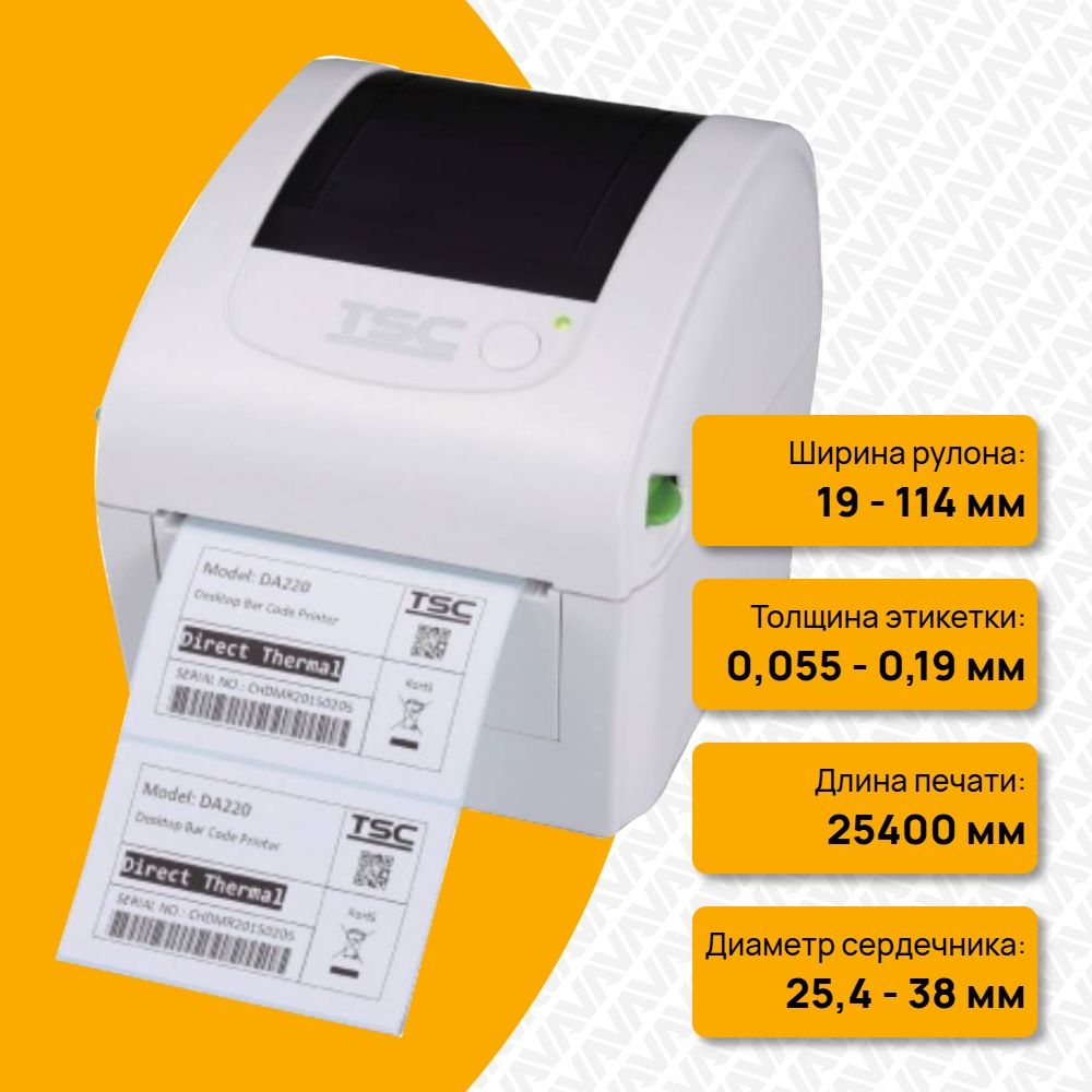 Термопринтер этикеток TSC DA220W [DA220W-A001-2102] предназначен для печати штрих-кода с высокоскоростным интерфейсом для широкого спектра отраслей, требующих точной, быстрой и беспрерывной эксплуатации, таких как оптовая и розничная торговля, логистика, здравоохранение.