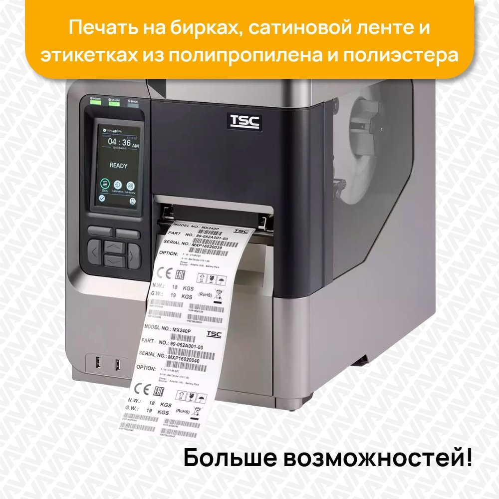 Термотрансферный принтер TSC MX341P [MX341P-A001-0002] предназначен для печати текста, графических изображений и наклеек в больших объемах, широко используемых в различных отраслях промышленности.